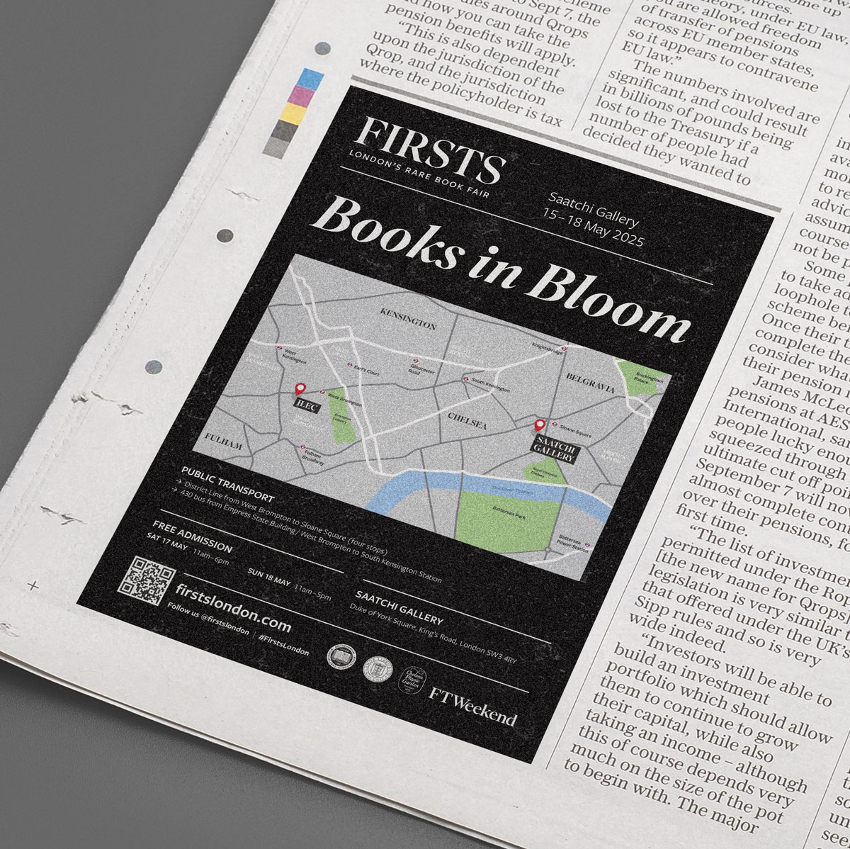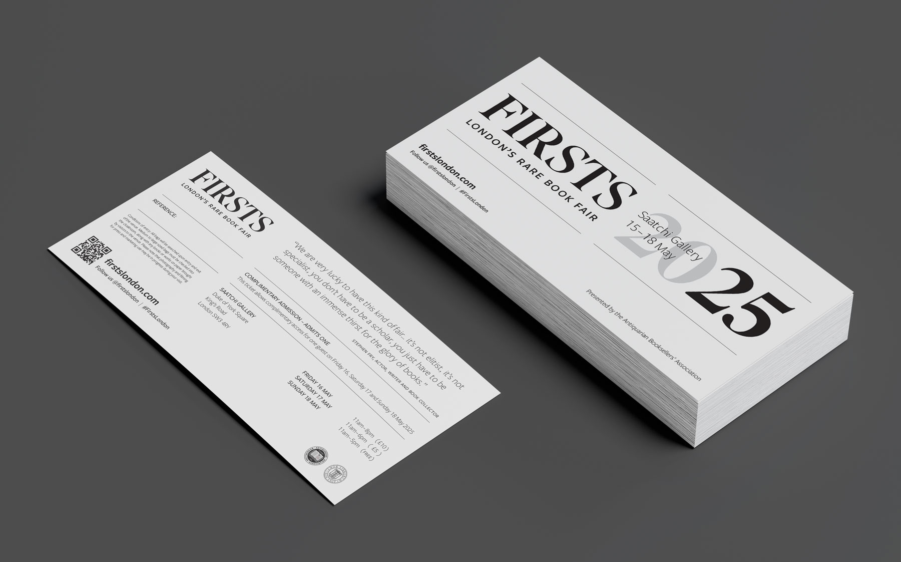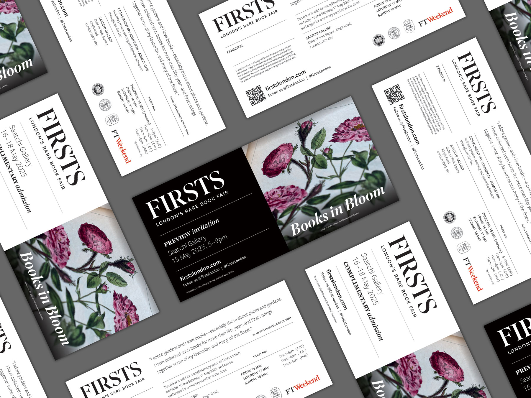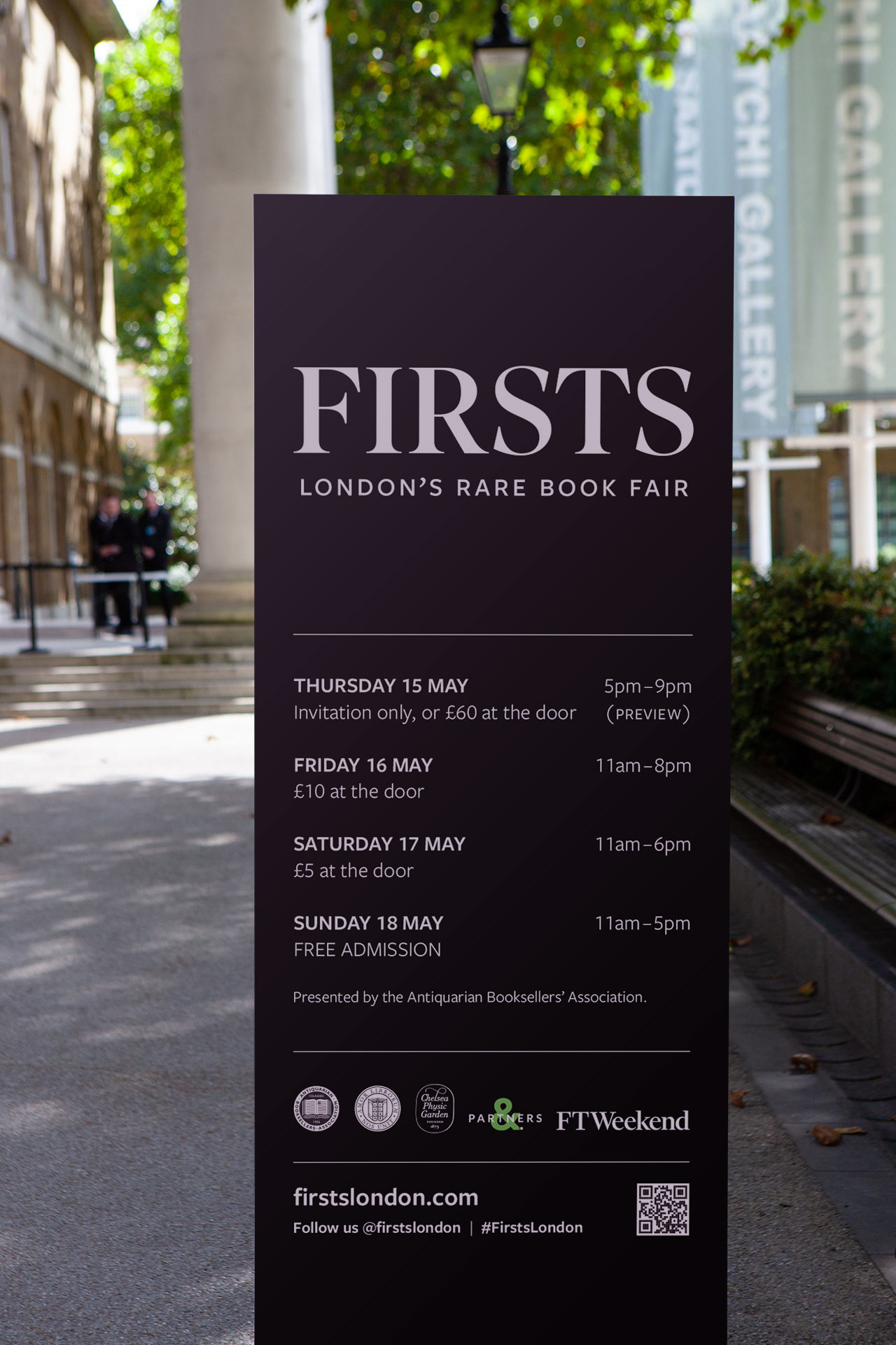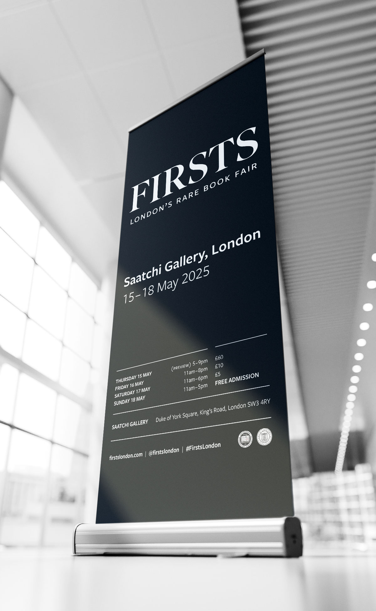 Design of overall theme and wide array of graphics – including posters, banners, leaflets/flyers, digital adverts, print adverts, onsite signage and tickets – for Firsts London, a Rare Book Fair located at Saatchi Gallery.