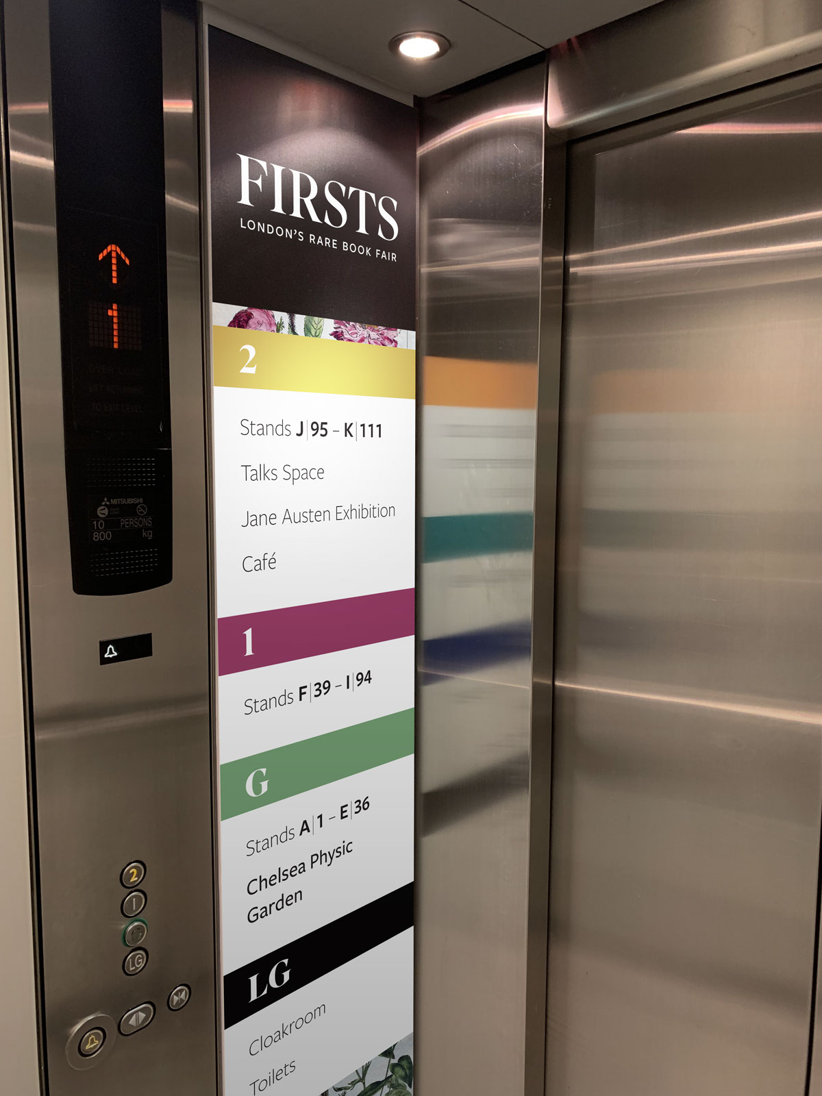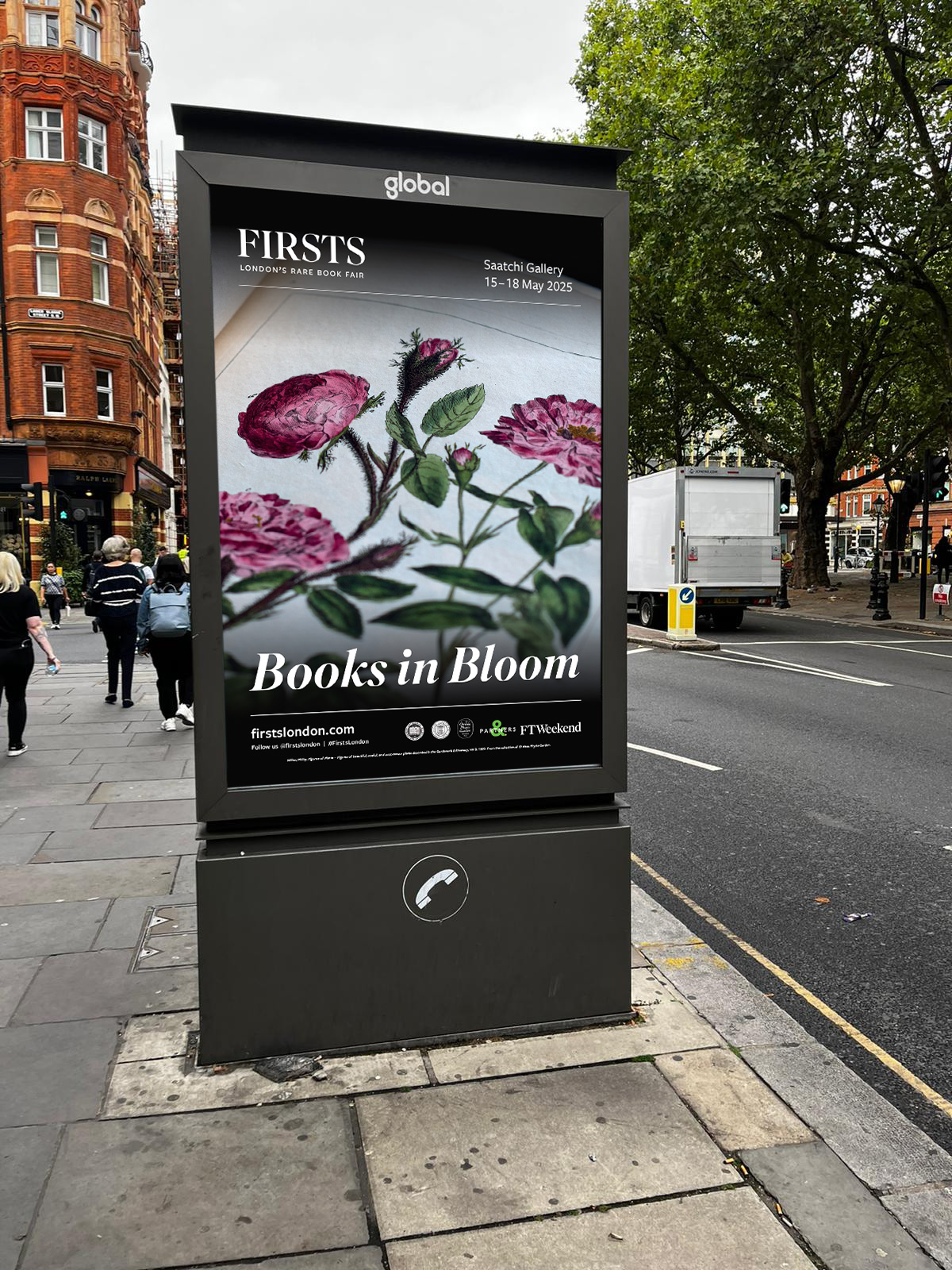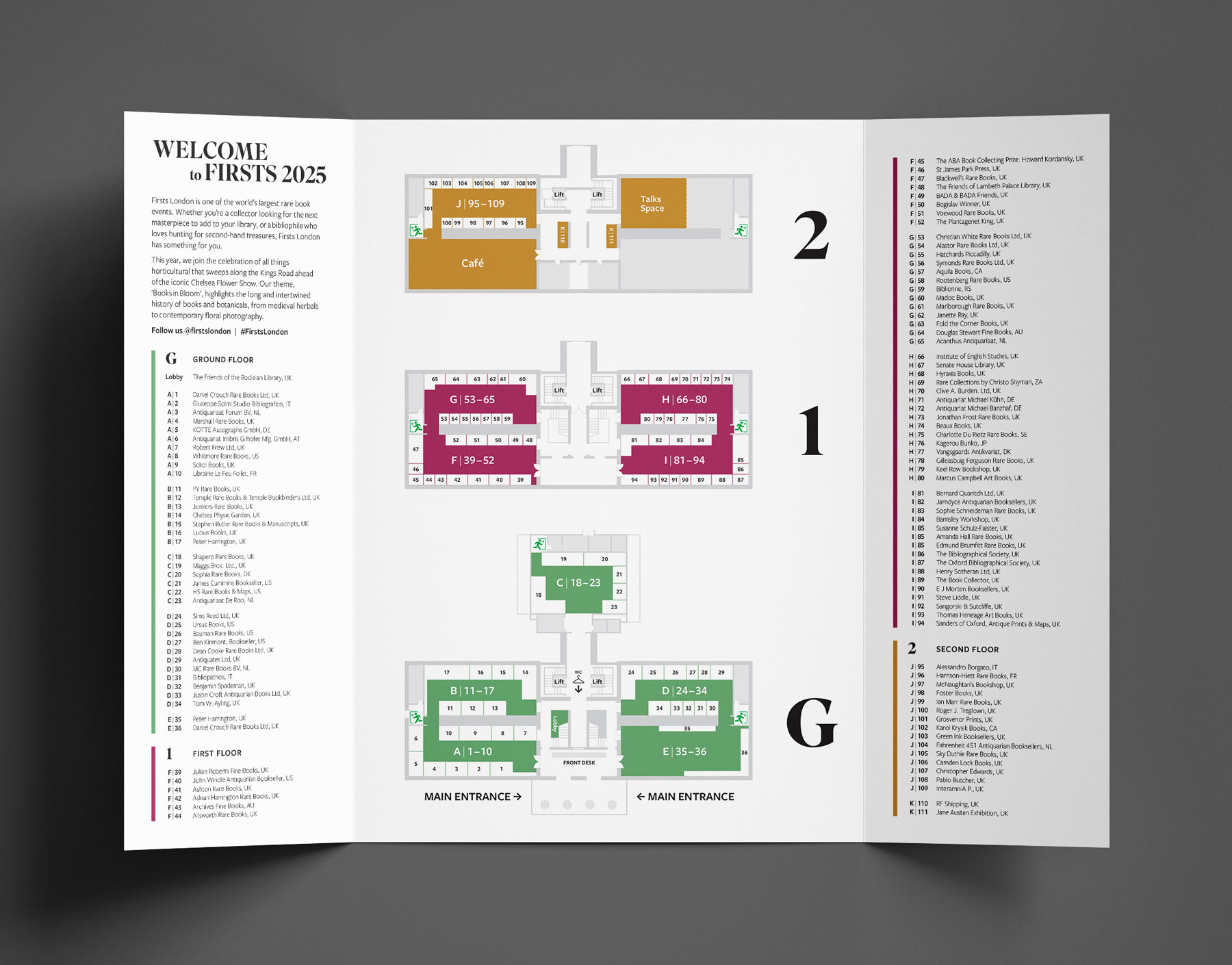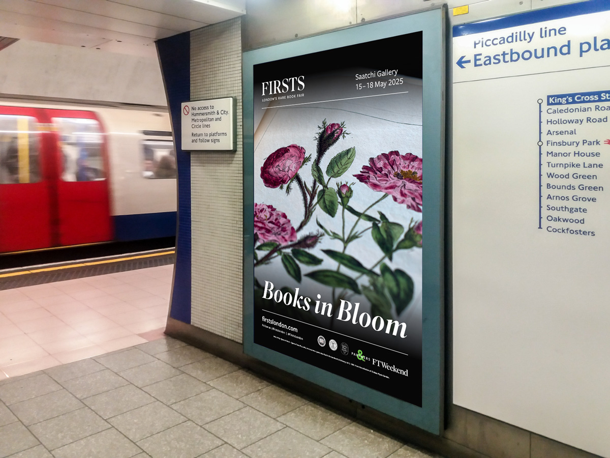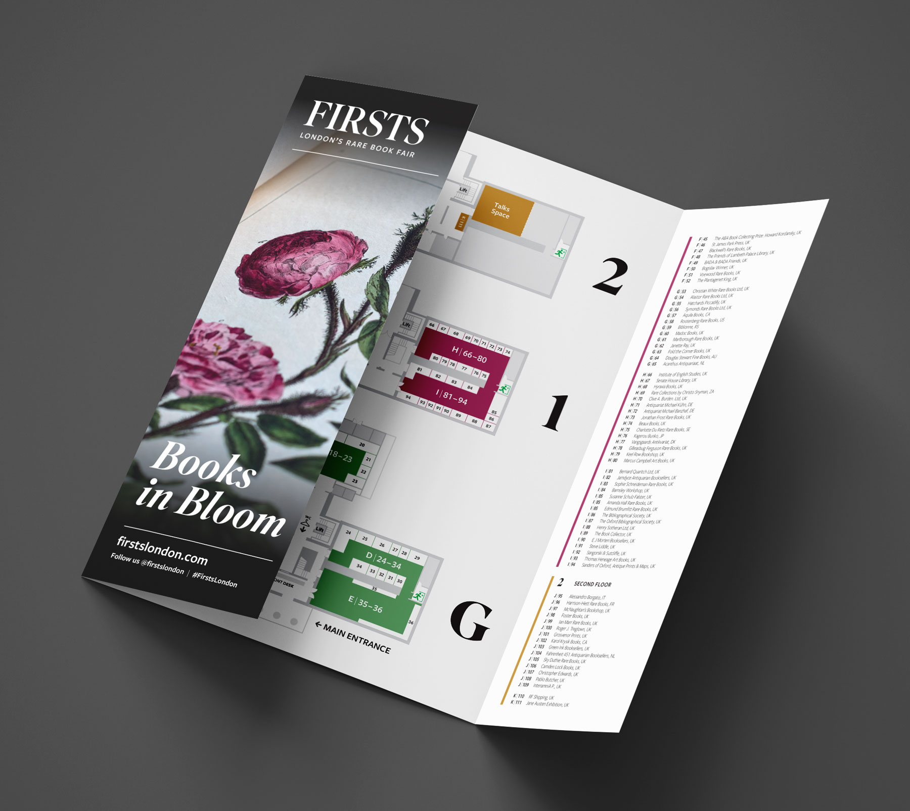 Design of overall theme and wide array of graphics – including posters, banners, leaflets/flyers, digital adverts, print adverts, onsite signage and tickets – for Firsts London, a Rare Book Fair located at Saatchi Gallery.