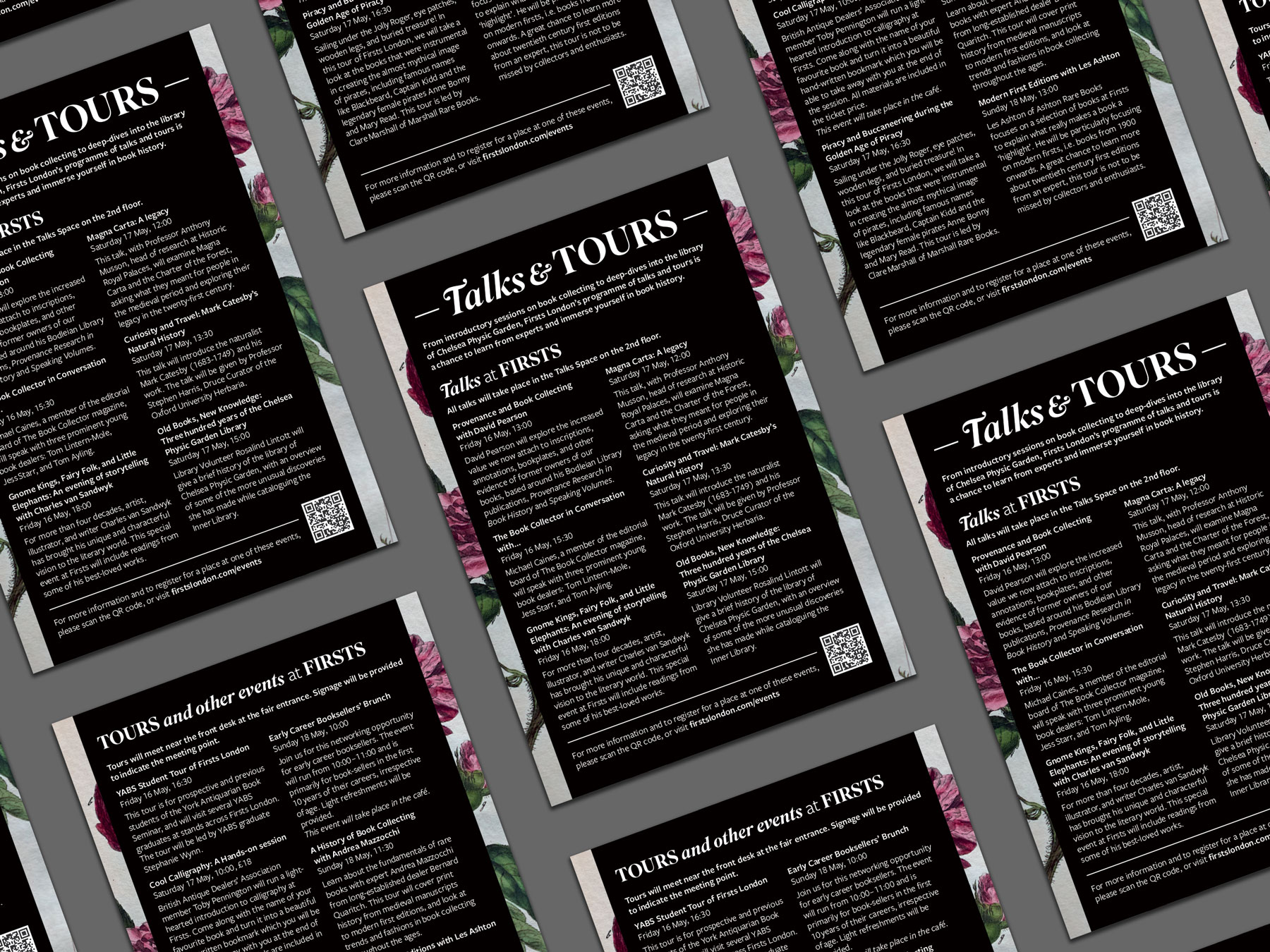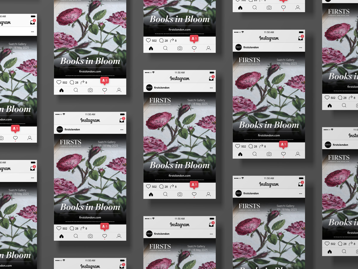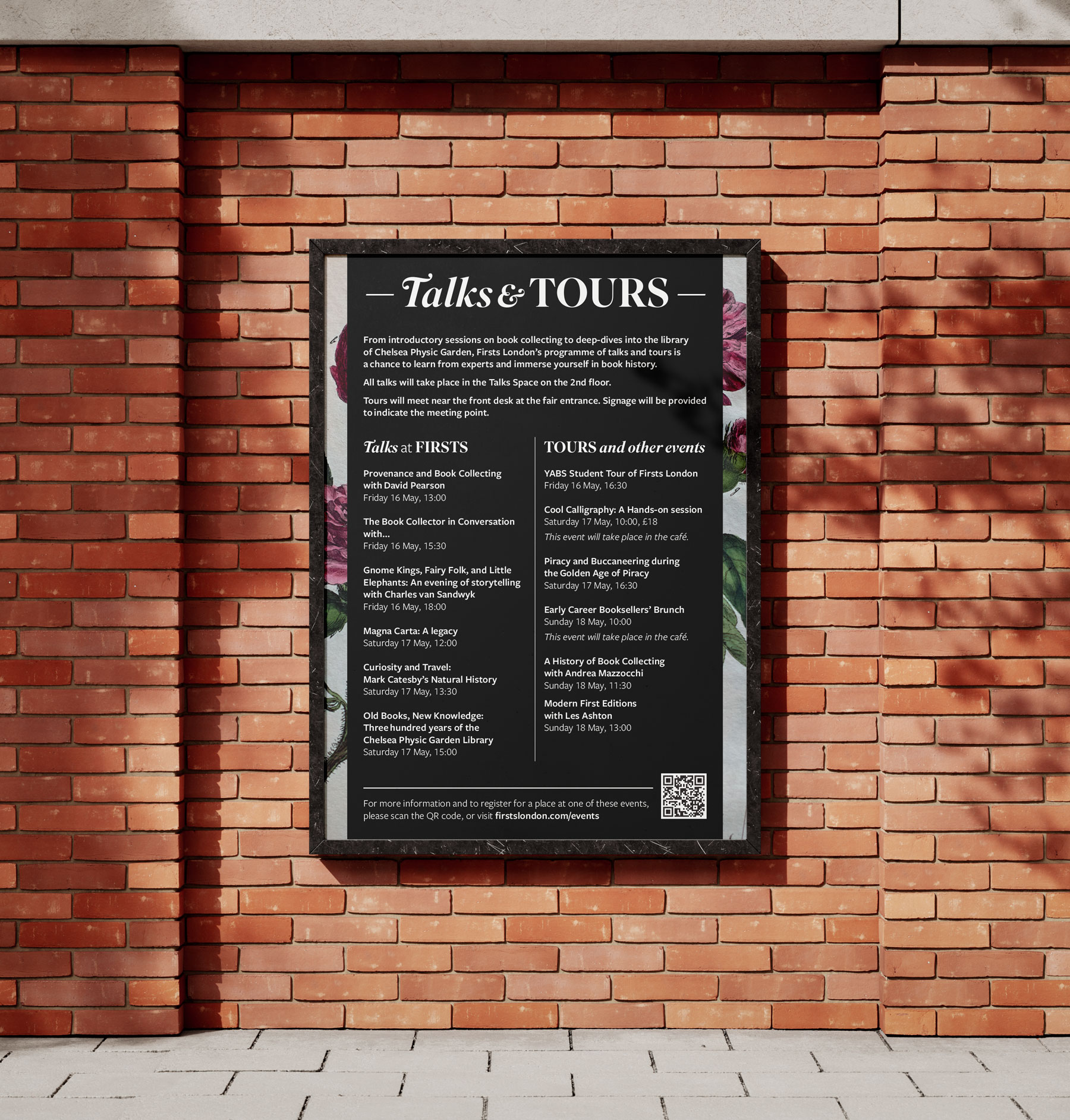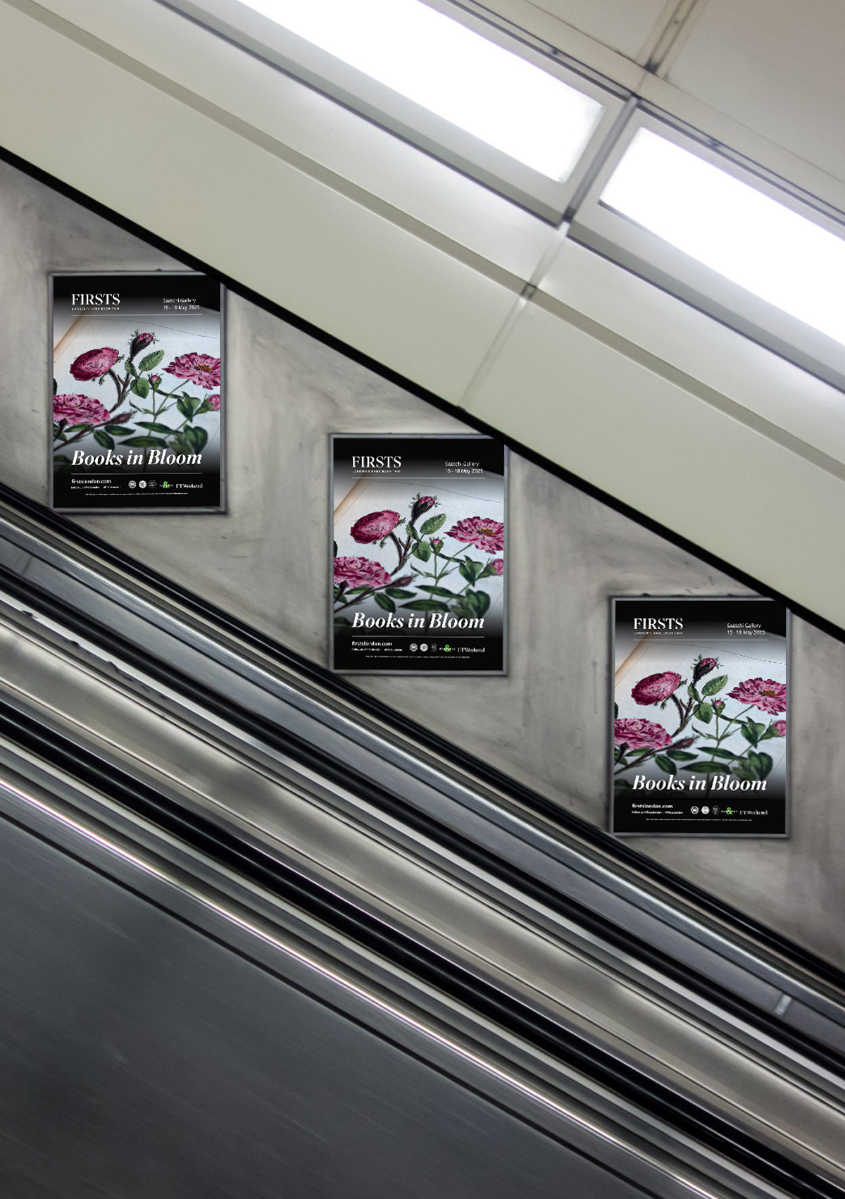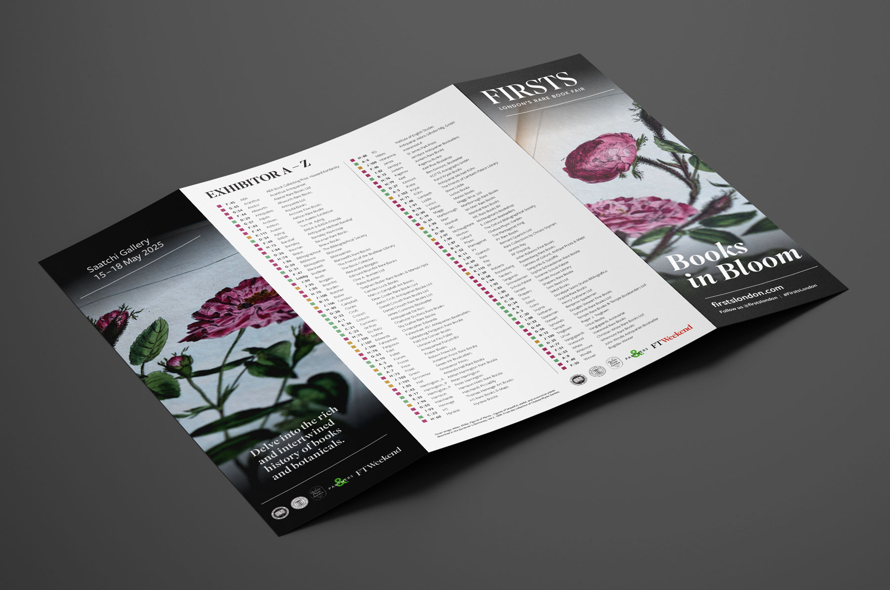 Design of overall theme and wide array of graphics – including posters, banners, leaflets/flyers, digital adverts, print adverts, onsite signage and tickets – for Firsts London, a Rare Book Fair located at Saatchi Gallery.